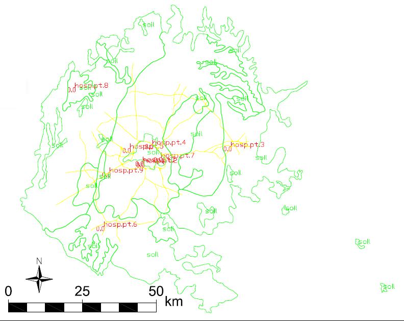 This example is based on the sample dataset of North Carolina (nc_spm_08_grass7). Point vector layer hospitals, line vector layer railroads and polygon vector layer soil_general have been exported to the text files, vertices have been renamed and the files have been merged. This final input was used as test data for the script.