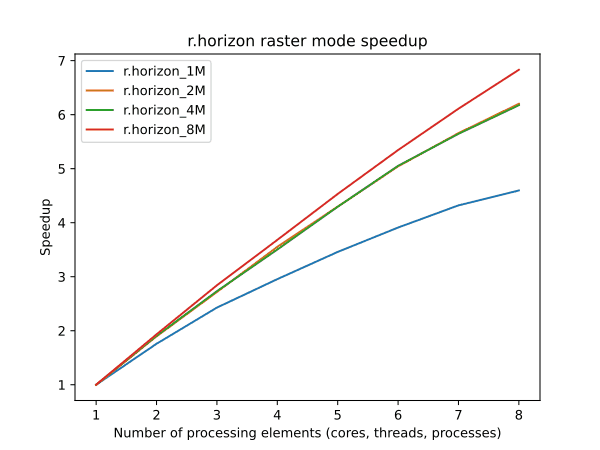 Parallel processing is implemented for the raster mode. To enable parallel processing, the user can specify the number of threads to be used with the nprocs parameter. Figures below show benchmark results running on Intel® Core™ i5-13600K CPU @ 3.5GHz. See benchmark scripts in the source code for more details.