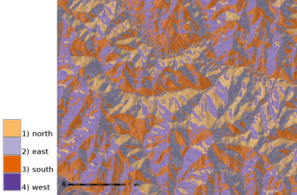 In the following example (based on the North Carolina sample dataset) we first generate the standard aspect map (oriented CCW from East), then convert it to compass orientation, and finally classify four major aspect directions (N, E, S, W):