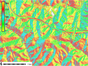 The aspect for slope equal to zero (flat areas) is set to zero (-9999 with -n flag). Thus, most cells with a very small slope end up having category 0, 45, ..., 360 in aspect output. It is possible to reduce the bias in these directions by filtering out the aspect in areas where the terrain is almost flat. A option min_slope can be used to specify the minimum slope for which aspect is computed. For all cells with slope \< min_slope, both slope and aspect are set to zero.