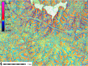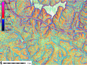 Profile and tangential curvatures are the curvatures in the direction of steepest slope and in the direction of the contour tangent respectively. The curvatures are expressed as 1/metres, e.g. a curvature of 0.05 corresponds to a radius of curvature of 20m. Convex form values are positive and concave form values are negative.
