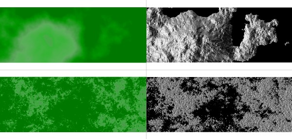 top: fractal dimension d=2.0005 (left: elevation map, right: aspect map)
