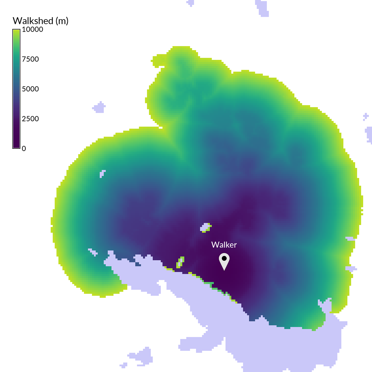Figure: Walkshed over a cost surface derived from topography and landcover
