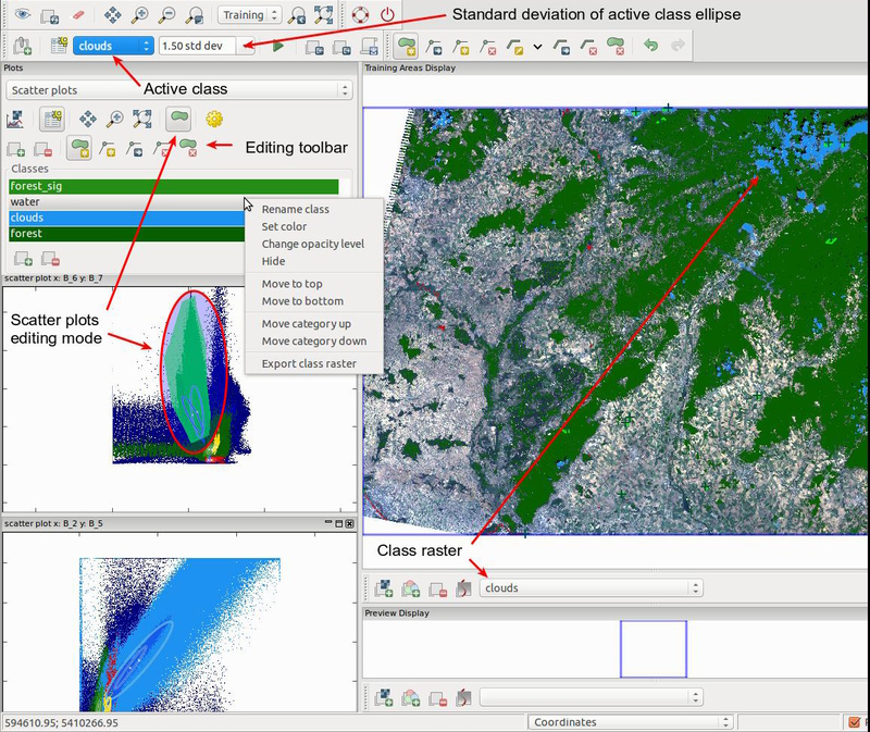 In the editing mode it is possible to select certain area by the polygon, which can be created and edited by tools in editing toolbar. After the area is selected, we can include or exclude it into active category by clicking on the first (plus) respectively second (minus) tool in the editing toolbar. In mapwindow corresponding pixels are shown by the class raster representing selected areas in scatter plots. In this case we can see clouds class raster (blue), forest class raster (green) and water class raster (red).