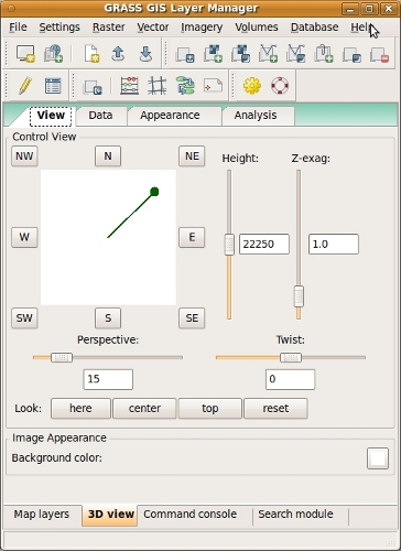 For each session of wxNviz, you might want the same set of 2D/3D raster and vector data, view parameters, or other attributes. For consistency between sessions, you can store this information in the GRASS workspace file (gxw). Workspace contains information to restore "state" of the system in 2D and if wxNviz is enabled also in the 3D display mode.